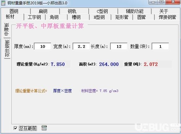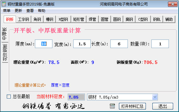 鋼材重量計算軟件,其中包含常用鋼板、工字鋼、角鋼、槽鋼、H型鋼、無縫管、鋼管、鋼軌、C型鋼理論重量的計算、磅差處理、金額大寫轉換等功能。