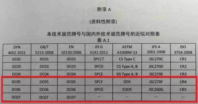 我們看看低碳鋼里哪些牌號符合要求(摘自【歐冶規(guī)范】),照片里已經(jīng)用紅框框出來了:DC05、DC06、DC07,大家回憶下,這幾個牌號是不是“特能沖”呢?