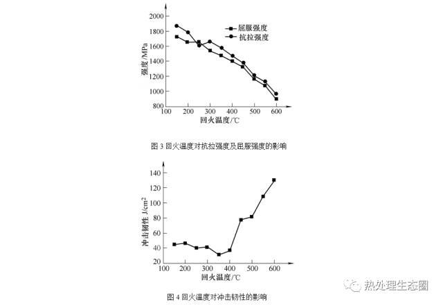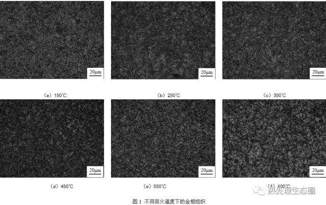圖1不同回火溫度下的金相組織。回火是將淬火鋼在A1以下溫度加熱,使其轉變為穩定的回火組織,并以適當方式冷卻到室溫的工藝過程。隨著回火溫度的升高,馬氏體開始發生分解,過飽和的а固溶體中析出彌散的碳化物,金相組織由回火馬氏體向回火索氏體轉變。當回火溫度升高至400℃以上時,已脫離共格關系的滲碳體開始明顯地聚集長大,片狀滲碳體的長度和寬度比逐漸縮小,最終形成粒狀滲碳體。在滲碳體聚集長大的同時,а相的狀態也不斷發生變化,當回火溫度在400℃以上時,由于馬氏體的分解、碳化物的轉變及聚集球化,使а相的晶格畸變大大減小,因此殘留應力基本消除。