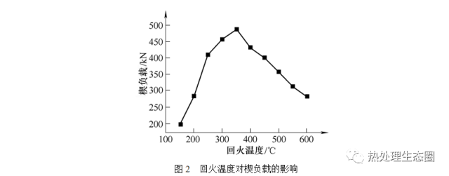 楔負載是螺栓綜合力學性能的一個體現,在試驗過程中,斷裂應在桿部或未旋合的螺紋長度內,而不應發生在頭部或頭桿交接處。在進行楔負載試驗過程中,螺栓斷裂前應達到相應的性能等級規定的最小拉力載荷。由圖2可以看出,隨著回火溫度的升高,螺栓所能承受最大力先升高而下降,在250~500℃之間回火,螺栓所能承受的最大力滿足國標要求。