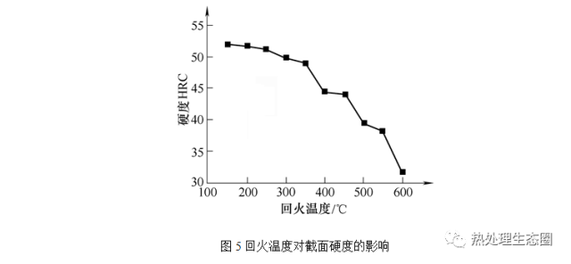 圖5為回火溫度對螺栓截面硬度的影響曲線,由圖中可以看出,隨著回火溫度的升高,截面硬度不斷降低。回火組織的硬度主要來自過飽和碳的固溶強化效應,回火的整個過程都伴隨著馬氏體中碳含量的降低,直接導致回火時硬度的降低。過渡碳化物的析出,雖可產生一定的硬化效果,但其影響小于固溶強化的減弱。在350℃以上回火硬度急劇降低的原因在于組織已經為回火屈氏體,碳化物轉變為滲碳體,共格關系破壞以及碳化物的聚集長大所致。