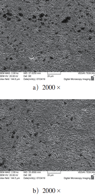 通過調整熱處理工藝制度,延長等溫淬火保溫時間,增強馬氏體向下貝氏體的轉變,能夠明顯看出沖擊吸收能量提高。將熱處理工藝制度改進后生產的螺釘安裝在燃燒室殼體上,重新進行了水壓爆破試驗,按照正常狀態裝配后。水壓升壓至16MPa、保壓45s后,持續升壓至殼體爆破。殼體爆破后,螺釘無斷裂或松動等情況,滿足使用要求。從螺釘斷口宏觀觀察結果來看,根據文獻[2]中關于脆性斷口的特征,該螺釘斷口附近無明顯塑性變形,斷口比較平齊,放射性花樣。斷口微觀觀察結果表明,斷口表面大量分布短而彎曲的棱線,小平面的應力集中,沖擊吸收能量低于標準要求,金相檢測表明在相界上有大量碳化物析出。根據文獻中對脆性斷裂特征的描述,水壓爆破試驗中斷裂的螺釘為脆性斷裂。①體心立方結構金屬具有較差的塑性,容易發生脆性斷裂。③材料加工過程引起內部組織變化,如有害元素的偏聚、脆性相的析出,以及回火脆性過熱過燒等。④晶粒度對材料脆性也有重大影響,晶粒粗大會導致材料韌性下降[3]。①零件受力。當零件上存在應力集中時,往往會導致局部材料超過應力極限,發生脆性斷裂。②使用溫度是重要條件。當使用溫度低于脆性轉變溫度時,材料會發生脆性斷裂。③應變率的影響。當材料應變率提高時,滑移難以進行,材料會發生脆性斷裂。根據電子顯微鏡和斷口宏觀觀察結果,斷裂螺釘斷口呈現脆性斷口特征。通過金相檢測結果顯示,熱處理完成后,在晶界和相界大量析出碳化物,碳化物存在于晶界和相界上時會使滑移難度增大,軸向拉力增大,引起抗拉強度提高、韌性下降,形成回火脆性。通過對螺釘設計狀態的校核能夠看出,本批螺釘沖擊吸收能量較低,不滿足標準要求。改進熱處理工藝制度后,提高螺釘材料沖擊吸收能量,螺釘能夠發揮可靠的連接性能。通過前后兩次水壓爆破試驗結果對比,螺釘材料韌性差是螺釘發生斷裂的主要原因。2)熱處理工藝參數設定不合理是造成螺釘脆性斷裂的主要原因。3)通過保證熱處理爐控溫精度,調整熱處理工藝制度,延長等溫淬火保溫時間,增強馬氏體向下貝氏體的轉變,減小晶界和相界碳化物的析出,可以提高螺釘等溫淬火后的韌性,防止其發生脆性斷裂。
