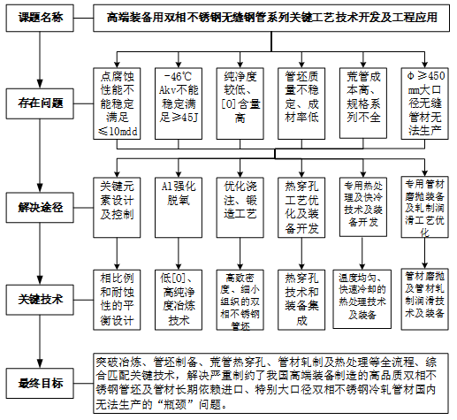 鋼鐵研究總院、江蘇武進不銹股份有限公司和山西太鋼不銹鋼股份有限公司組成的聯合研發團隊,依托國家轉型升級強基工程項目,歷經十二年,從系列雙相不銹鋼鋼種設計和開發、冶煉、熱穿孔荒管制備、成品管材軋制熱處理等方面進行工藝和技術研發,針對高端裝備用雙相不銹鋼無縫管所提出的更高耐點腐蝕性能、低溫沖擊韌性要求以及高性能大口徑雙相不銹鋼冷軋管材國內無法生產的“瓶頸”問題,突破了高端裝備用雙相不銹鋼“兩相平衡設計-高純凈度冶煉及澆注-熱穿孔-冷軋-均溫快冷熱處理”全流程組織控制技術,集成了大規格管坯、大口徑荒管和成品管制造核心裝備,并實現了高品質雙相不銹鋼系列無縫鋼管的規?;a及應用。該技術思路線如下: