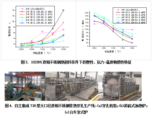 針對大口徑雙相不銹鋼管材熱穿孔加工抗力大、塑性差的問題,通過熱扭轉模擬熱穿孔變形系列對比試驗,發現了雙相不銹鋼的熱扭轉峰值應力-溫度敏感性特性,以及N元素降低熱扭轉塑性的機制,制定了雙相不銹鋼N元素和熱穿孔溫度內控區間。