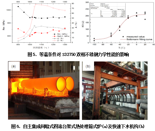 針對雙相不銹鋼成品管材力學性能不穩定、易脆斷、耐蝕性能不足的問題,通過開展“熱處理工藝對雙相不銹鋼相組成、相比例及室溫力學性能影響的研究”、“雙相不銹鋼管材低溫沖擊韌性控制技術研究”,確定了無有害相析出、兩相平衡的高沖擊韌性、高耐點腐蝕性能的雙相不銹鋼成品管材開發準則。利用溫度均勻、冷卻快速的雙相不銹鋼管材固溶熱處理工藝與集成技術,制定了針對不同口徑雙相不銹鋼管材的不同形式、不同參數固溶處理工藝方法,實現了φ610mm雙相不銹鋼管材均勻加熱、保溫及快速冷卻,保證了無析出相和均勻細小的組織控制。在實現高端裝備用系列雙相不銹鋼管熱處理裝備及工藝的全覆蓋的同時,保證了全系列雙相不銹鋼管材點腐蝕率≤3.5mdd、-46℃沖擊功KV≥100J。