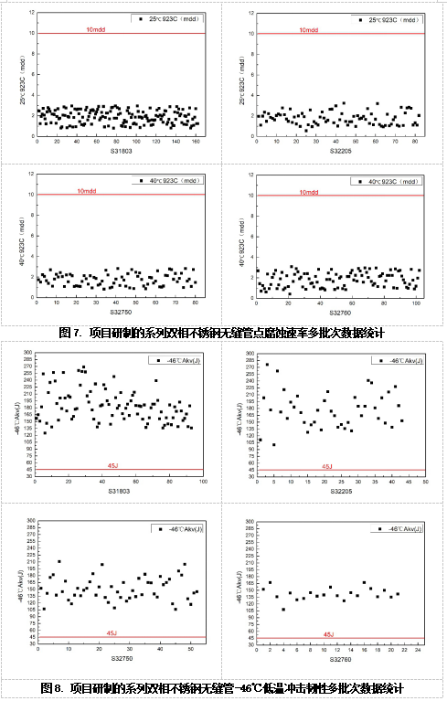 項目以油氣輸送、海洋工程及船舶、石油煉化、環保工程等高端裝備制造業重大需求為導向,開發的系列牌號S31803、S32205、S32750、S32760和系列規格(φ8mm~φ610mm)雙相不銹鋼無縫管產品,不僅可滿足GB/T21833、ASTM A789、ASTM A790的要求,其全氧含量、非金屬夾雜物水平、常溫拉伸性能、低溫沖擊韌性、耐點腐蝕性能等實物達到芬蘭Outokumpu、瑞典Sandvik公司等國外先進企業同類產品水平,其中非金屬夾雜物水平、尺寸精度、最大生產規格優于國外同類產品。經中國金屬學會組織的科技成果評價,項目科技成果總體達到國際先進水平,其中大口徑冷軋雙相不銹鋼無縫管屬國際首創。