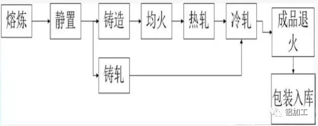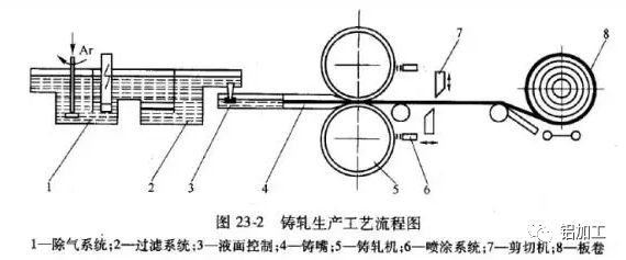 鑄軋工藝流程:液態金屬、前箱(液面控制)、鑄軋機(潤滑系統、冷卻水)、剪切機、卷取機。