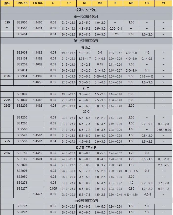 圖2、雙相不銹鋼的牌號和成分