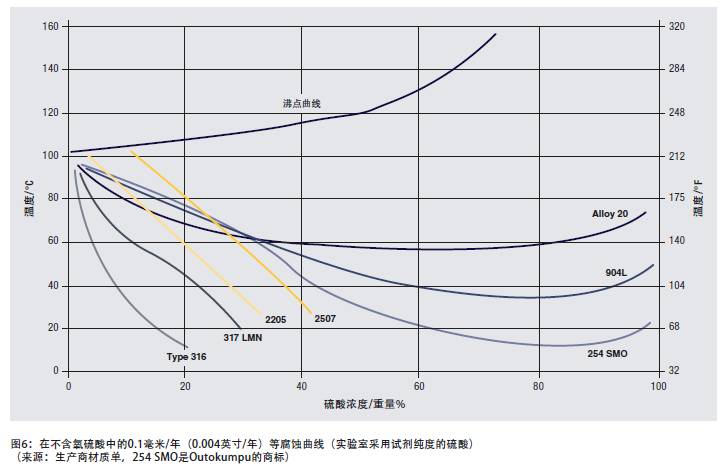 為了說明雙相不銹鋼在強酸溶液中的耐腐蝕性,圖6給出了硫酸溶液的腐蝕數(shù)據(jù)。介質(zhì)條件從低酸濃度的弱還原性環(huán)境到高濃度的氧化性環(huán)境及中等濃度熱溶液的強還原性環(huán)境。