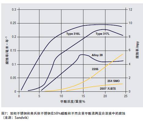 圖7顯示在沸點溫度下,50%醋酸和不同含量甲酸混和溶液中雙相不銹鋼和奧氏體不銹鋼的腐蝕。盡管304和316不銹鋼可用于室溫和中等溫度下的強有機酸介質(zhì),但2205和其他雙相不銹鋼在許多涉及高溫有機酸的工藝中占優(yōu)勢,而且由于它們耐點蝕和耐應力腐蝕,也可用于鹵代烴工藝。