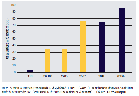 圖9給出了若干軋制退火的雙相不銹鋼和奧氏體不銹鋼在苛刻的氯化物介質(zhì)中的相對耐氯化物應力腐蝕斷裂性能。得出這些數(shù)據(jù)的液滴蒸發(fā)試驗腐蝕條件很苛刻,因為試驗溫度為120℃(248℉)的高溫,并且氯化物溶液由于蒸發(fā)而濃縮。試驗中兩種雙相不銹鋼2205和2507最終在所受應力達到其屈服強度的某一百分比時發(fā)生斷裂,但這一百分數(shù)比316不銹鋼相應的百分比值高得多。由于雙相鋼在常壓下的氯化物水溶液中能夠耐應力腐蝕斷裂,例如耐保溫層下的腐蝕,所以在已知304和316不銹鋼會發(fā)生斷裂的氯化物介質(zhì)中,可以考慮使用雙相不銹鋼。
