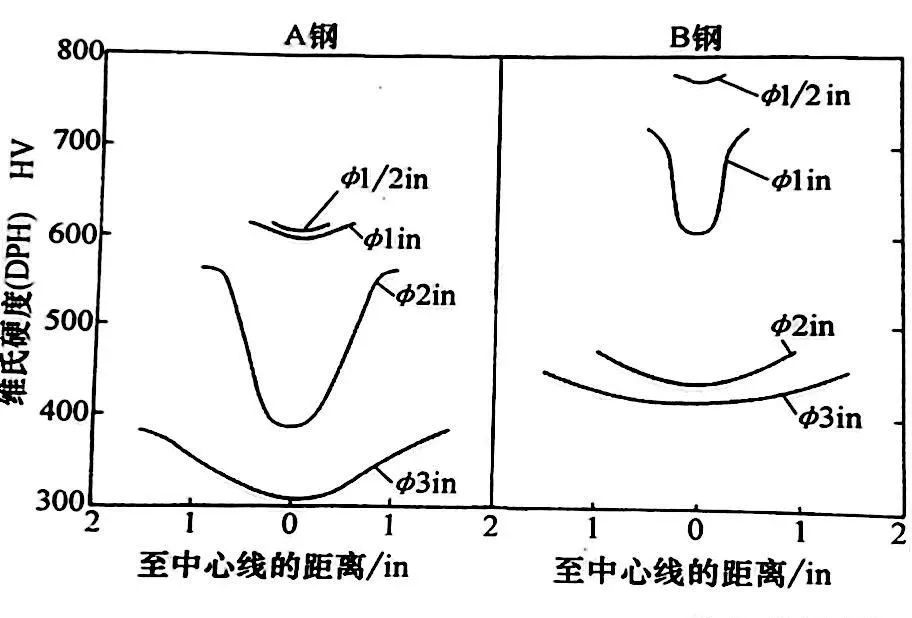 對于一個給定的含碳量,當為100%馬氏體組織時,可達到最大硬度,這種組織只能從表面或小型鋼試樣的薄截面上獲得。大截面上無法達到足夠大的冷卻速度,從而無法完成100%馬氏體轉變,因此零件的馬氏體層深度和硬度會降低。