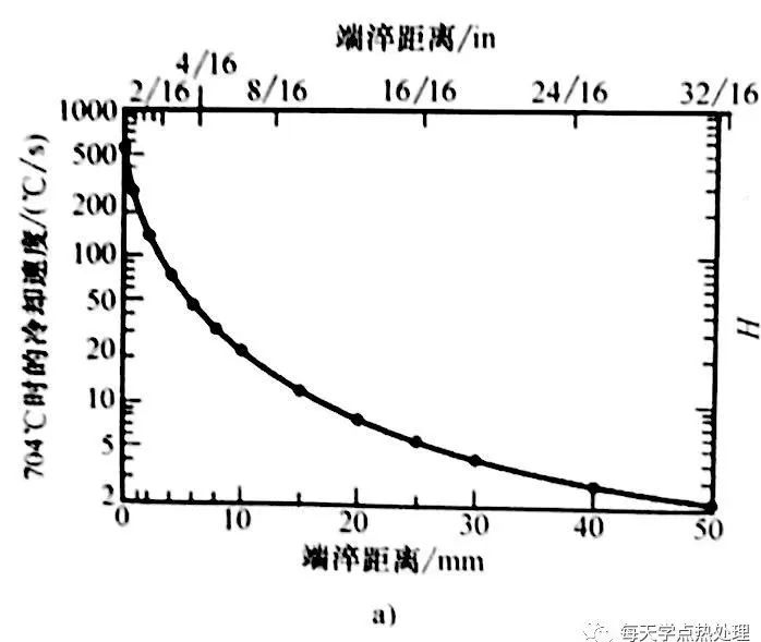 末端淬火曲線的拐點(見圖10)表示淬火相變產物馬氏體的量發生了一個突變,它代表約50%的馬氏體量的點拐點外的喬米尼曲線陡峭,以拐點處可看作為平均硬化深度,它與內應力的大小和畸變便相關。但實際上,在拐點處實際觀察到或預測到的硬度值對質量控制人員或熱處理操作者來講影響不大。而表面和心部硬度的上下限之間的半硬化位置,硬度曲線在此處的斜率是有價值的信息。
