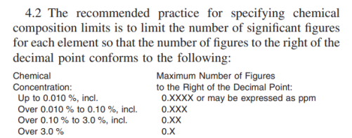 2. 當單個化學元素的百分含量大于0.010%,且不大于0.10%時,小數點之后的最大有效位數應是3位;