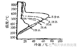 油中含有水分影響油的冷卻性能。一般地講使常規(guī)淬火油冷速有所加大 ,而對快速淬火油 ,因水會溶解其中的速冷劑 ,反使其冷速有所下降。圖 1和圖2分別是按照國際標(biāo)準(zhǔn)用的 ivf冷速測定儀測定的含