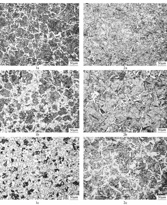 氮能促進晶內(nèi)鐵素體(IGF)的生成,顯著細化鐵素體晶粒。龔維冪等人對比研究了V-N鋼和V鋼對晶內(nèi)鐵素體形核和細化鐵素體晶粒的影響,如圖1所示。由金相照片可以看出,N對晶內(nèi)鐵素體的形成有顯著影響。在V鋼中添加0.014%N,使晶界鐵素體和晶內(nèi)鐵素體數(shù)量大大增加,當?shù)葴貢r間為2s(見圖1的1a和圖1的2a)時,V-N鋼中生成了大量晶界鐵素體和部分晶內(nèi)鐵素體,而V鋼中只生成了很少量的晶界鐵素體;隨著等溫時間的增加,當?shù)葴貢r間為4s(見圖1的1b和圖1的2b)時,V-N鋼中生成的晶內(nèi)鐵素體數(shù)量進一步增加,而V鋼中只有晶界鐵素體略有增加并且長大,沿晶界連接起來形成環(huán)狀;當?shù)葴貢r間為20s(見圖1的1c和圖1的2c)時,V-N鋼中生成了大量細小的晶內(nèi)鐵素體,而V鋼中生成的鐵素體不但數(shù)量很少,而且尺寸粗大。由此可見,N對促進晶內(nèi)鐵素體的生成,細化鐵素體晶粒具有非常重要的作用。
