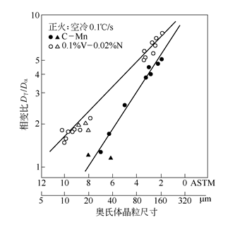 圖3表明,在相同奧氏體晶粒尺寸下,V-N鋼的相變比率比C-Mn高得多,可見釩和氮提高了相變細化比率,對鐵素體晶粒的細化有明顯影響。同時,奧氏體晶粒尺寸對相變比率Dγ/Dα也有較大影響,奧氏體晶粒越細則相變比率就越大。