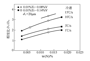 圖4氮對V-Ti-N鋼鐵素體晶粒細化的影響表明,在V-N-Ti鋼中,隨著氮含量的增加,在各種不同的冷卻速度下,相變細化比率都有明顯的提高,這是由于增氮促進了碳氮化釩在奧氏體-鐵素體晶界上的析出,有效阻止了鐵素體晶粒的長大,同時,增加了相變后鐵素體的形核位置,起到細化鐵素體晶粒尺寸的作用。可以看出,為提高V-N微合金鋼的相變比率,需要較高的氮含量。研究結(jié)果表明,較高的氮含量可以促進VN在奧氏體區(qū)析出。VN析出量越多,奧氏體晶粒就越細。因此,較高氮含量的V-N微合金鋼的晶粒細化,是由VN在奧氏體區(qū)析出,使奧氏體晶粒細化和相變時Dγ/Dα相變比增大引起的。