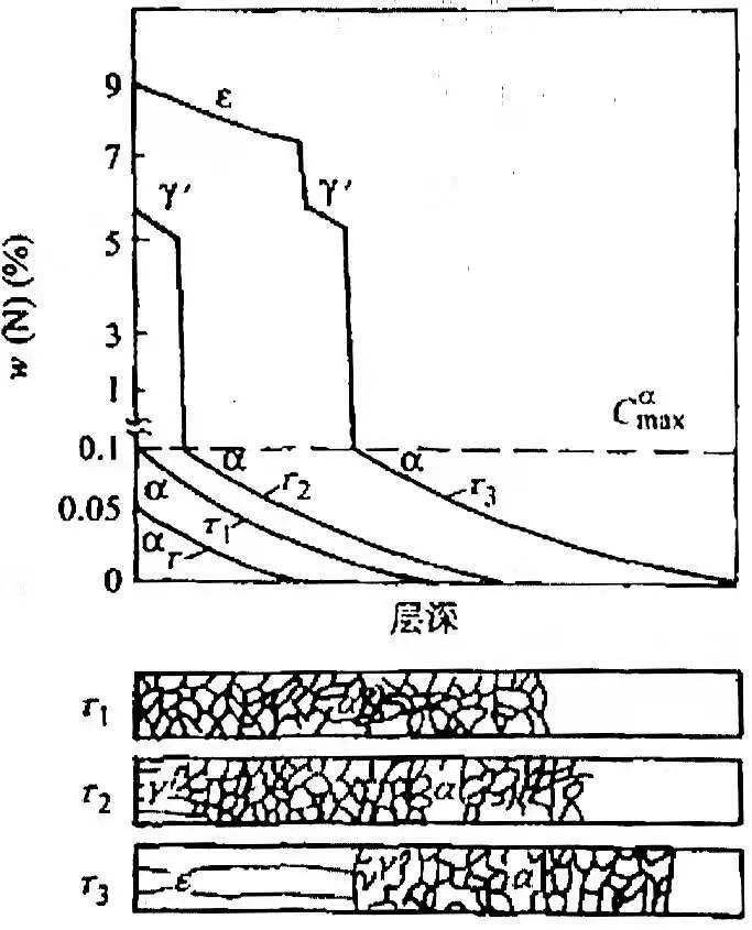 滲氮層的形成過程詳見圖1 。在滲氮初期,表層的α固溶體未被N所飽和,滲氮層的深度可隨時間的增加而增加。隨著氣相中氮的不斷滲入,使α達到飽和氮含量Cmax,即τ1時刻。在τ12時間內,氣相中的氮繼續向工件內擴散而使α過飽和,引發α→γ′反應,產生γ′相。深度時間繼續延長,表面形成一層連續分布的γ′相,達到γ′的飽和極限后,表面開始形成含氮量更高的ε相 。