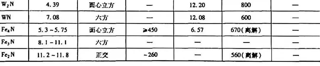 Fe-N系中存在的相如表 1 所示。除表中所列各項外,Fe-N系中可能出現含氮馬氏體α′和介穩定相α〞。前者是滲氮后快冷的產物,呈體心正方點陣,硬度較高可達650HV左右;α〞氮化物的分子式為Fe16N2,或Fe8N呈體心正方點陣。