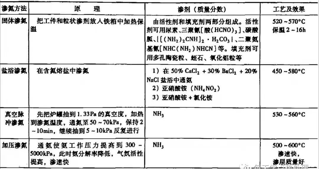 除氣體滲氮方法外,還有固體滲氮、鹽浴滲氮、真空脈沖滲氮、加壓滲氮、流態床滲氮、催化滲氮、電解氣相滲氮、高頻滲氮、短時滲氮等各種因地制宜的滲氮方法。詳見表12 。