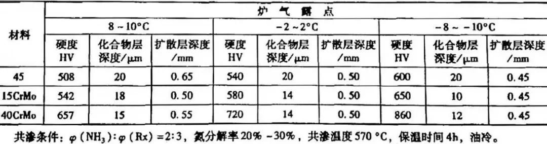 ▼表14 吸熱式氣氛(RX)露點對氮碳共滲層深度與表面硬度的影響