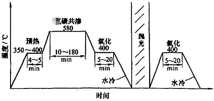 鹽浴氮碳共滲或硫氮共滲后進行氧化、拋光再氧化復合處理稱之為QPQ(Quench-Polsh-Quench)處理。 這項技術近年來得到廣泛應用,其處理工序為預熱 → 520~580℃氮碳共滲或硫氮共滲 → 在300~400℃氧化浴中氧化10~30mm → 機械拋光 → 在氧化浴中再次氧化。氧化的目的是消除工件表面殘留的微量  及  ,產生的廢水可以直接排放,工件表面生成致密的Fe3O4膜。