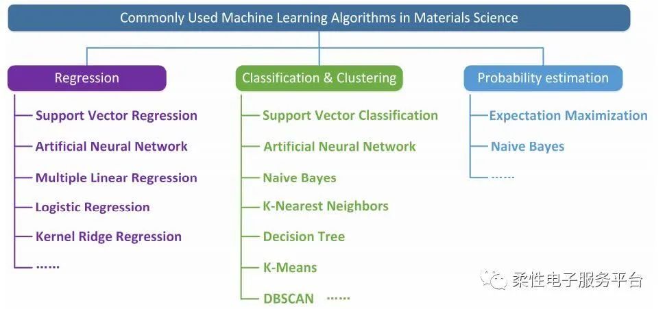 在這里,最終目標代表給定問題,通常以目標函數的形式表達。選擇合適的機器學習算法是構建機器學習系統的關鍵步驟,因為它極大地影響了預測精度和泛化能力。每種算法都有自己的應用范圍,因此,沒有適用于所有問題的算法。如圖4所示,材料科學中常用的機器學習算法可以分為四類:概率估計、回歸、聚類和分類。具體而言,概率估計算法主要用于新材料發現,而回歸、聚類和分類算法用于宏觀和微觀層面的材料特性預測。此外,機器學習方法通常與各種智能優化算法相結合,例如GA,SAA或PSO算法,主要用于優化模型參數。此外,這些優化算法也可用于執行其他困難的優化任務,例如空間配置和材料屬性的優化。