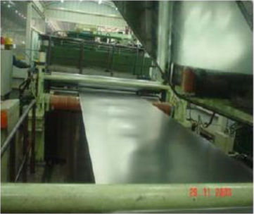 平整是一種小壓下量的軋制,變形量一般為0.5%~3%,其主要目的消除退火屈服平臺、改善力學性能,調整帶鋼板型及粗糙度等,最終提高冷軋板帶的質量。由于平整的變形量較小,通常把壓下率轉化成延伸率進行控制。平整有干平整和濕平整兩種模式。延伸率速度檢測有激光測速和編碼器測速兩種形式。平整工序的缺陷有相當一部分是前幾道工序產生在本工序集中顯現出來,如板形、粘結等。此外,如果對平整機組控制不好,不僅會擴大前道工序帶來的缺陷,而且會產生新的缺陷,如振動紋、平整斑等。產生原因是軋制板型、張力和退火工藝控制不佳造成。存在粘接缺陷的鋼卷在開卷時產生粘結紋,影響板面質量和使用。減輕或避免粘接紋的手段是提高開卷速度或在開卷機與入口S輥之間增加防粘結輥,調整開卷角度使帶鋼始終以開卷切線方向開卷。橫折印的紋理方向基本上與帶鋼運行方向成90°,有時貫穿整個板寬,有時出現在一定范圍內(邊部居多)。橫折印缺陷不但肉眼可見,甚至有手感。
