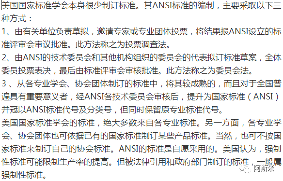 美國國家標(biāo)準(zhǔn)學(xué)會本身很少制訂標(biāo)準(zhǔn)。其ANSI標(biāo)準(zhǔn)的編制,主要采取以下三種方式: