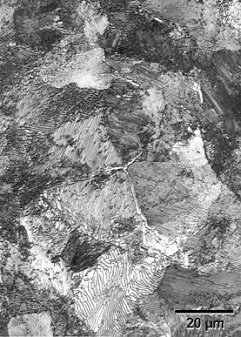 板條狀鐵素體單相組成的組織,也稱為鐵素體貝氏體。形成溫度在貝氏體轉(zhuǎn)變溫度區(qū)的最上部。板條鐵素體之間為富碳奧氏體,富碳奧氏體在隨后的冷卻過程中也有類似上面的轉(zhuǎn)變。無碳化物貝氏體一般出現(xiàn)在低碳鋼中,在硅、鋁含量高的鋼中也容易形成。