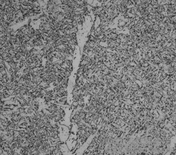 同上,但滲碳體在鐵素體針內(nèi)。過冷奧氏體在350℃~ms的轉(zhuǎn)變產(chǎn)物。其典型形態(tài)是雙凸透鏡狀含過飽和碳的鐵素體,并在其內(nèi)分布著單方向排列的碳化物小薄片;在晶內(nèi)呈針狀,針葉不交叉,但可交接。與回火馬氏體不同,馬氏體有層次之分,下貝氏體則顏色一致,下貝氏體的碳化物質(zhì)點比回火馬氏體粗,易受侵蝕變黑,回火馬氏體顏色較淺,不易受侵蝕。高碳高合金鋼的碳化物分散度比低碳低合金鋼高,針葉比低碳低合金鋼細。