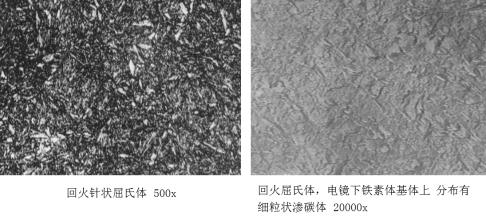 碳化物和a-相的混合物。它由馬氏體在350~500℃時中溫回火形成。其組織特征是鐵素體基體內(nèi)分布著極細小的粒狀碳化物,針狀形態(tài)已逐漸消失,但仍隱約可見,碳化物在光學(xué)顯微鏡下不能分辨,僅觀察到暗黑的組織,在電鏡下才能清晰分辨兩相,可看出碳化物顆粒已明顯長大。
