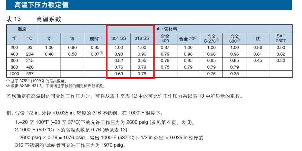 溫度升高后,TUBE管的最大工作壓力會(huì)降低。溫度系數(shù)見下表。