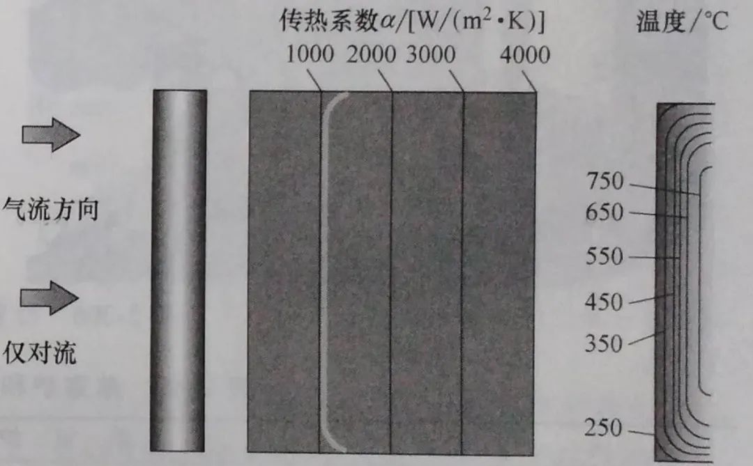 ▲圖3 液體淬火和氣體淬火中的傳熱系數(shù)及溫度分布