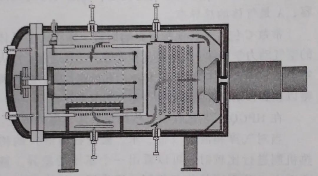 關(guān)閉密閉門后,室中涌入淬火氣體。用兩臺風(fēng)機(jī)來加速氣體通過負(fù)載和分別位于負(fù)載上方和下方的兩個水冷熱交換器。除了冷卻淬火氣體,熱交換器還起到使氣體流速均勻化的作用。