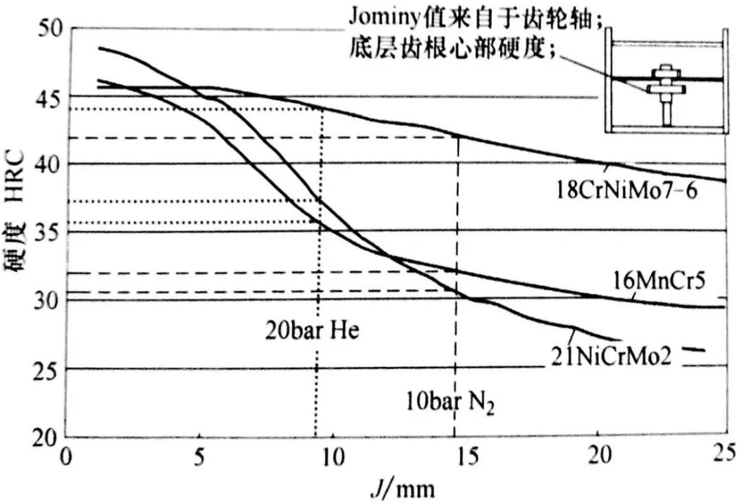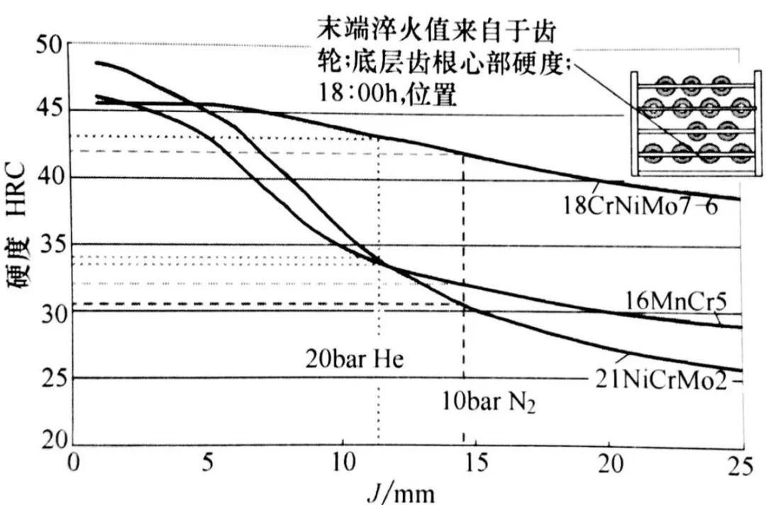 圖中展示了分別用20bar氦氣和10bar 氦氣淬火時,底層的末端淬火值。此外,圖中還加入了16MnCr5、21NiCrMo2 和 18CrNiMo7-6 鋼的末端淬火曲線。給出了典型的HH級鋼的淬透性曲線。從而可預(yù)測使用這些鋼種時齒根心部的硬度值。