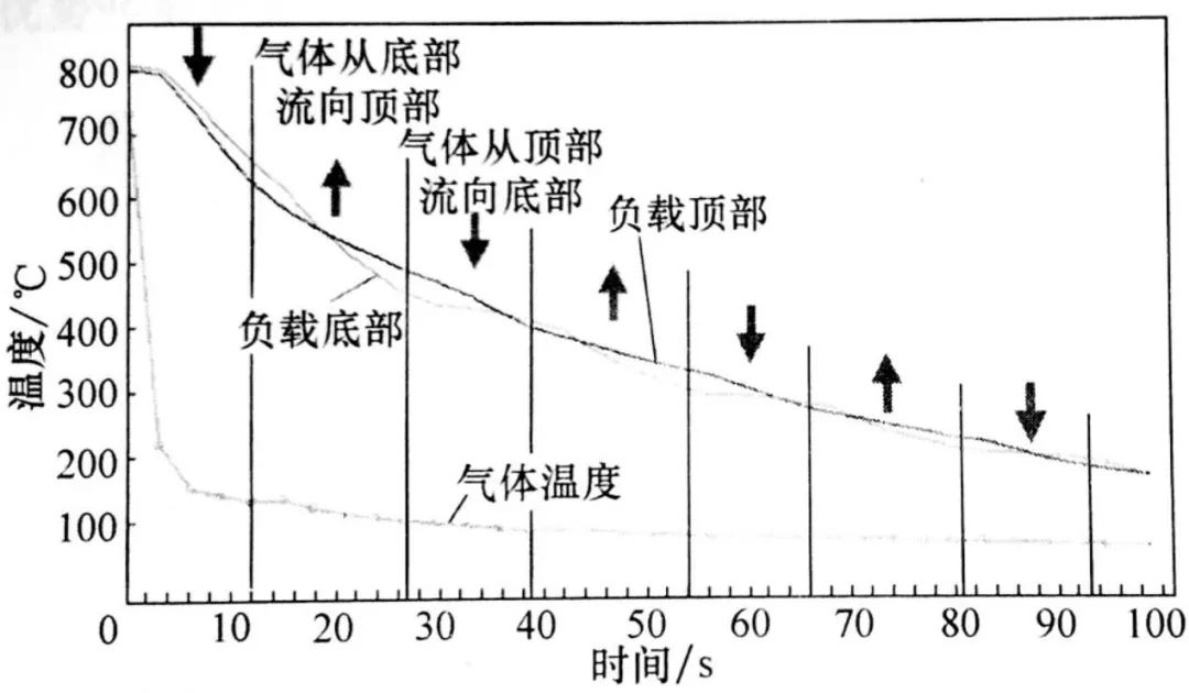 圖16 所示為采用氣流轉(zhuǎn)向技術(shù)的淬火室示意圖。為了達(dá)到交替轉(zhuǎn)變氣流方向的目的,淬火室內(nèi)配有氣動式翻板。氣流方向是從頂部到底部還是從底部到頂部,取決于閥門的設(shè)置。氣流方向的交替轉(zhuǎn)變是按時間來控制的。