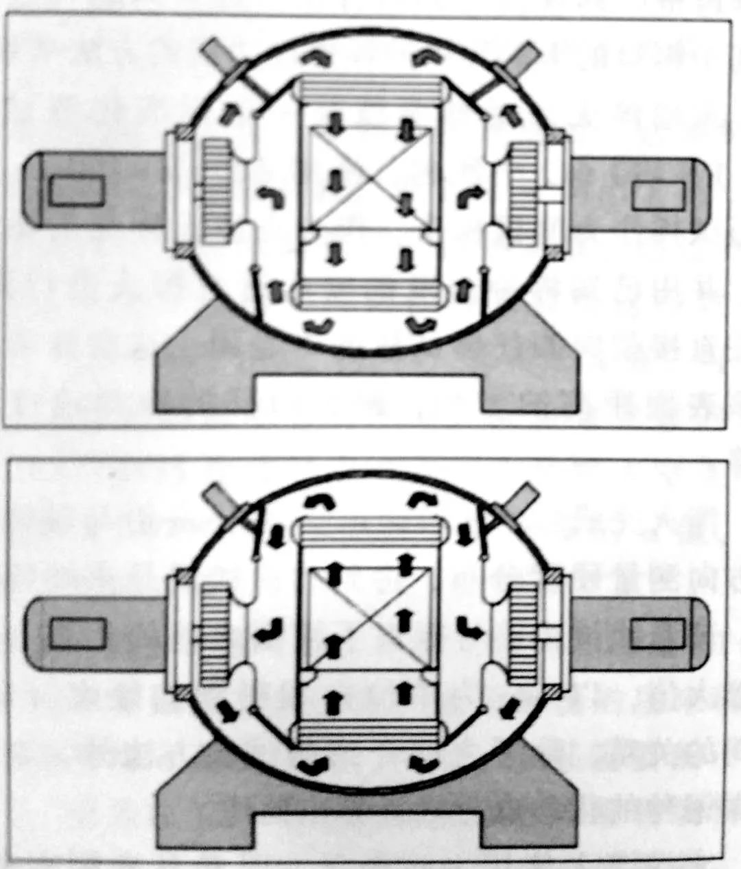 圖4 所示為單室爐中的氣流。加熱和淬火在同一個室內(nèi)進(jìn)行,因此室的設(shè)計是兩種功能之間的優(yōu)化折中。氣體被一個風(fēng)機(jī)加速,并被引導(dǎo)經(jīng)過負(fù)載和熱交換器。通過改變翻板和導(dǎo)流板的位置,可以改變氣流的方向。單室爐的設(shè)計是可變的,如方形室或圓形室、用氣體噴嘴淬火及單向、雙向或四向定向冷室。