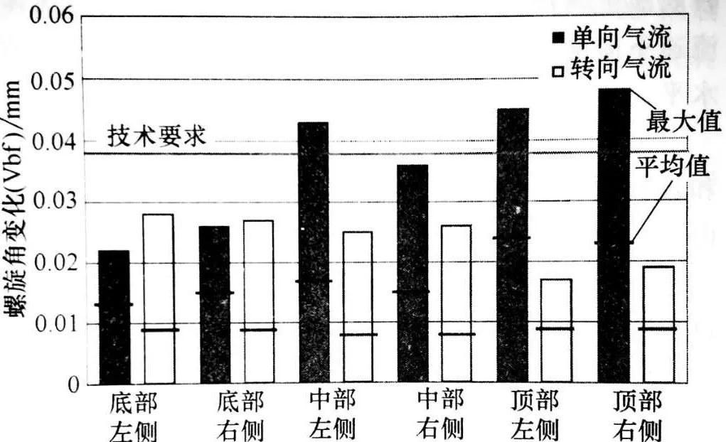注:單向和轉(zhuǎn)向氣流的比較,最終傳動小齒輪在熱處理后上部、中部、下部的螺旋角變化;熱處理后最大值為38um。