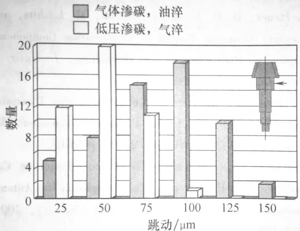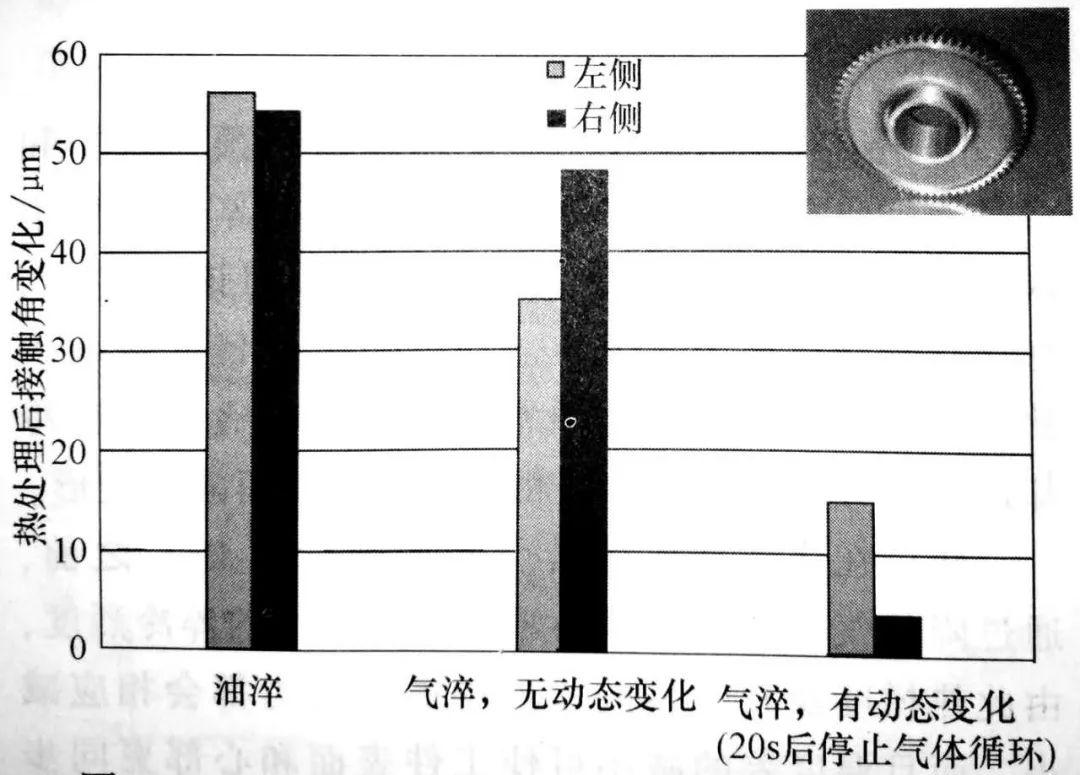 除了測量熱處理后的絕對值外,還需測量熱處理過程中的變化。這里,熱處理過程中 的變化是指熱處理前后 值的差異。與油淬相比,當(dāng)采用動態(tài)HPGQ時,齒輪左側(cè) 。的變化平均減少了37%, 齒輪右側(cè)則減少了 17% 。