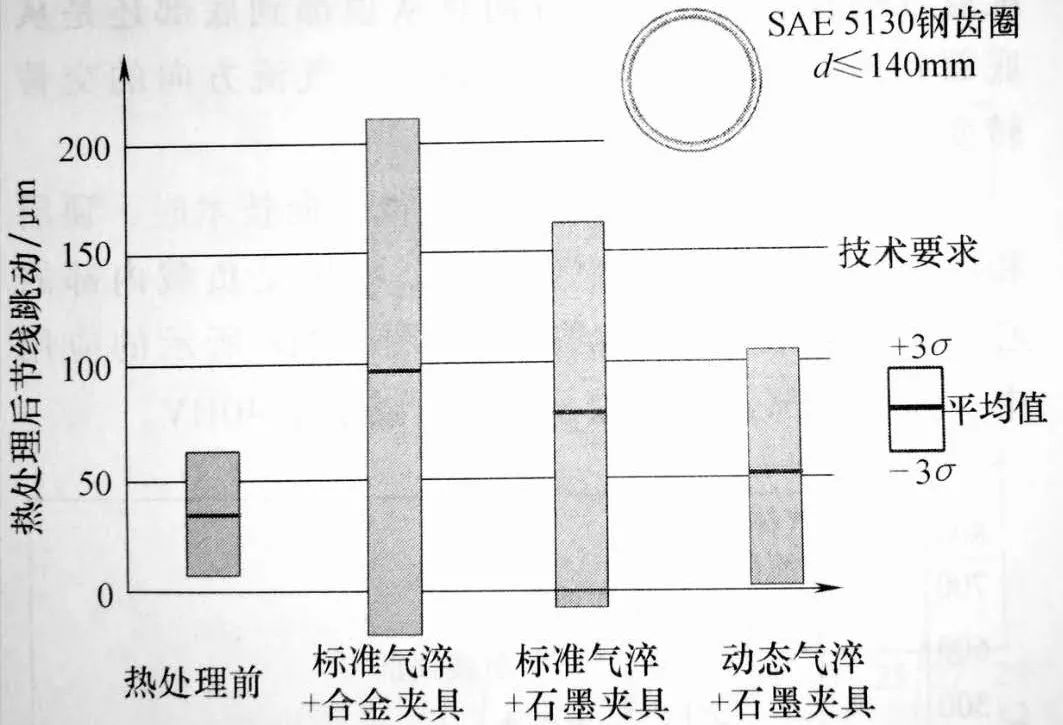 在另一個由5130M鋼制造的內(nèi)齒圈的應(yīng)用中,熱處理過程中的平均跳動量減少至7μm, 通過采用動態(tài)淬火,最大跳動量減少至41μm 。