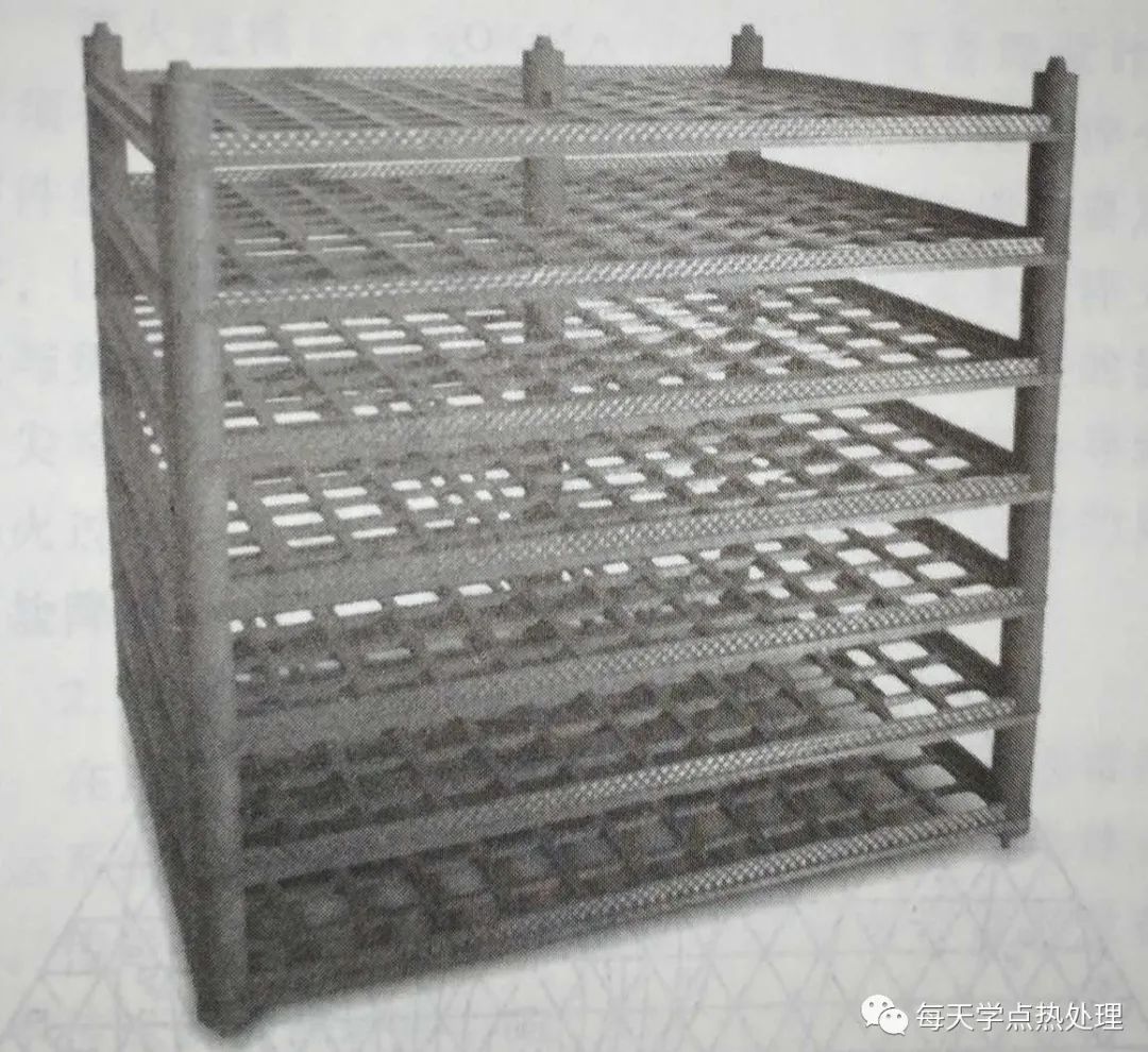 有兩類夾具材料可用于 HPGQ : 高鎳合金和CFC 材料。高鎳合金如 DIN 1.4818也可用于油淬。CFC 材料是由嵌合了纖維的碳基材料制成的,其中含有體積分?jǐn)?shù)為50%~60%的纖維。CFC是耐熱材料,在采用保護(hù)氣體或真空時,其使用溫度高達(dá)2000℃ 。CFC的強(qiáng)度甚至?xí)S著溫度升高而增加。與室溫相比,1000℃時的熱彎曲強(qiáng)度增加了 15% 。CFC制成的夾具具有輕型化的特點(diǎn),且在高溫下使用時不會發(fā)生蠕變。與由合金制成的夾具不同, 即使在使用多年后,家具也不會發(fā)生彎曲或破裂。當(dāng)在CFC夾具上處理零件時,保證了夾具中所有零件都能被水平裝夾,這使得在很多應(yīng)用中零件變形有所減少。與鋼材的密度7900kg/m3相比,CFC的密度只有(1400~1650) kg/m3, 這也是CFC夾具比合金夾具更輕并能更快地被加熱的原因。然而,由于CFC的比熱容[1~2kJ/ (kg·K) ] 比鋼材[0. 5kJ/(kg·K) ] 的高,在一定程度上削減了CFC的這一優(yōu)勢。典型的CFC夾具如圖23 所示。
