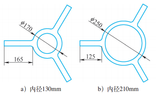 中心環(huán)的主要作用是保持多層碼垛的穩(wěn)固性和承重。最初設計中心環(huán)時出于降低工裝自重的考慮,根據(jù)中心導向立柱外徑115mm確定:中心環(huán)內徑130mm、壁厚20mm,如圖5a所示。在方案論證過程中,圖5a方案有兩個弊端:第一,中心環(huán)橫截面積太小,多層碼垛自身穩(wěn)定性不好,發(fā)生歪斜時中心立柱將承受巨大的側向負荷,高溫狀態(tài)下會加大中心導向立柱的彎曲變形,甚至發(fā)生傾倒。第二,托架支臂實際屬于一種單懸臂受力結構,負荷在懸臂的遠端,這樣懸臂越長,同等負荷下下壓力矩會越大,從而高溫狀態(tài)下的下垂變形也會越大。因此,決定中心環(huán)內徑加大到210mm,壁厚仍為20mm,如圖5b所示。據(jù)此,軸承內圈單層托架的初步設計方案確定為:中心環(huán)內徑210mm、壁厚20mm;托架支臂形式選擇圖4a方案;為減輕自重中心環(huán)側壁開6個減重孔,這主要是因為2個托架支臂之間由于中心環(huán)圓周弧長過長,所以減重孔開成2個,中間保留一個支撐肋。設計方案試裝成品如圖5c所示。
