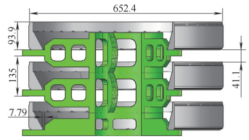 如圖6所示,軸承外圈總高93.9mm,考慮到滲碳溫度下托架的膨脹量和長期使用工裝的變形,碼垛層之間必需預留一定的變形空間,但該尺寸不宜大,否則會影響碼垛層數(shù)。綜合考慮后確定中心托架的總高控制在135mm,這樣兩個軸承圈之間有41.1mm的間隙,軸承圈與托架支壁的最小間隙還有約8mm,從而保證了碼垛安全。