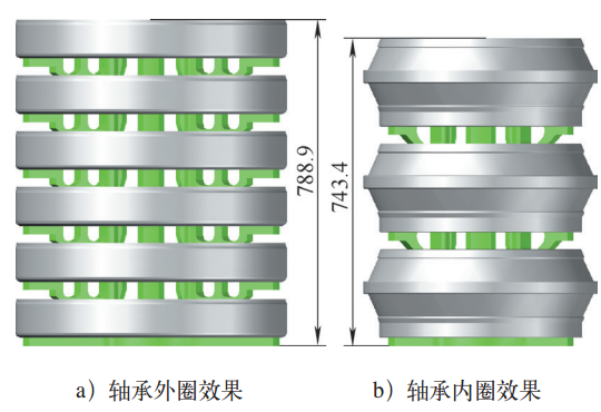 在單個軸承圈工裝設計方案確定以后,具體裝爐需結合每種爐型的實際有效區(qū)尺寸具體設計。設計原則是:充分發(fā)揮最大爐容,以提高效率;同時要控制總重,不能超過吊具負載限額。現(xiàn)以我單位450kW井式氣體滲碳爐裝爐方案的設計作一簡要介紹。前已述及,450kW井式氣體滲碳爐實際裝料應控制在φ2100×3400mm圓柱體積內。水平直徑內,經(jīng)過計算,圓周方向軸承內外圈間隔擺放,可擺放6只。中間圓心處如擺放軸承外圈,與圓周擺放的3個外圈最小間隔僅剩13mm,如用于滲碳過程,結合來料配裝,軸承在外圈比例較高時,可以在中間圓心處擺放軸承外圈;如用于滲碳后的淬火過程,考慮每只軸承圈周邊溫度場的均勻性,建議在中間圓心處擺放軸承內圈。平面擺放布置方案如圖8a所示,最大外圓直徑2040mm,沒有超出φ2100mm的最大限制。平面擺放布置方案的三維效果如圖8b所示。