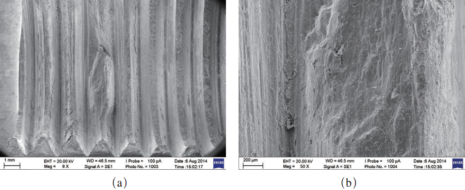 掃描電鏡下觀察,螺紋損傷部位呈擠壓、磨損形貌,可見物質轉移、堆積,損傷表面未見嵌入的外來多余物,螺桿、螺栓損傷區域微觀形貌分別如圖3、圖4所示。
