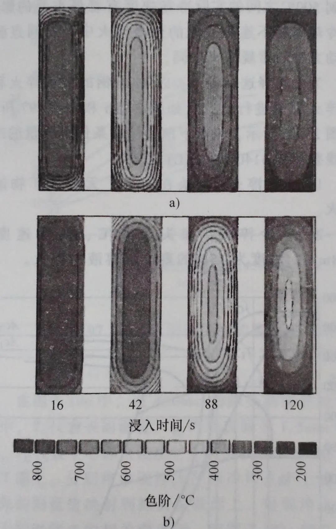 用在Liscic/Nanmac探頭一半長度的橫截面處測量的溫度計算隨時間變化的傳熱系數值,開發了一個二維傳熱計算機程序,來計算淬火期間的溫度場,這一程序可用來產生淬火過程中傳熱動力學的圖形顯示。以一個不銹鋼試樣(Φ50mm×200mm) 為例,將其分別淬入礦物油和25%的PAG 溶液中后16s、42s、88s和120s的圖形如圖3 所示。這些圖形更加清楚地顯示了兩種淬火間傳熱動力學的顯著差異。