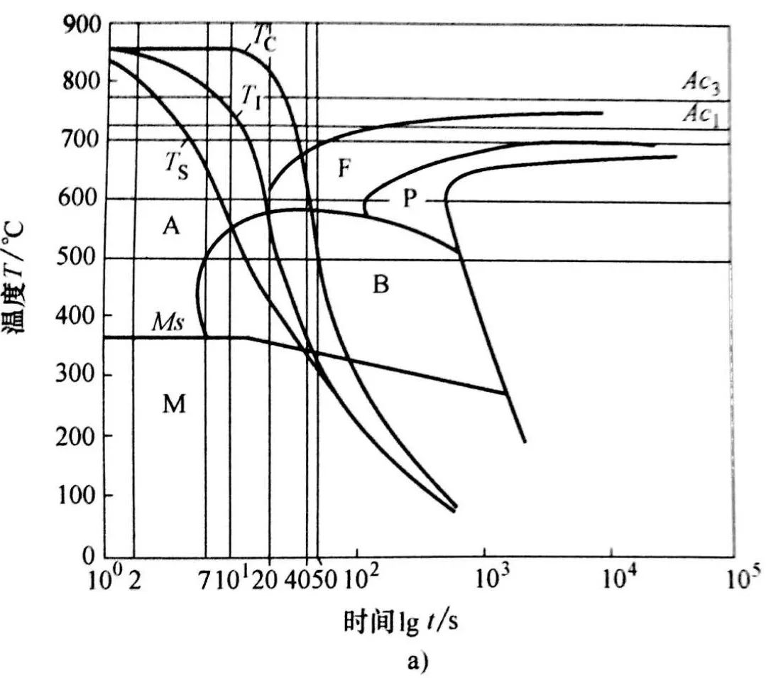 將奧氏體化的工件浸入淬火介質時,開始了兩個不同的過程:放熱(熱力學過程)和微觀結構轉變(冶金過程)。實際上,沿橫截面半徑的每個點的微觀結構轉變發生的時間點并不同,當各點處溫度降至A1 時才開始(依TTT圖的規律)轉變。開始轉變的時間取決于橫截面的尺寸和淬火冷卻介質的冷卻強度。在每個特定點處得到的硬度取決于轉變后顯微組織的成分,轉變后顯微組織的成分又在很大程度上取決于鋼材的淬透性,也就是在每條等溫線處孕育期的長短。因為在橫截面的每個點上,只有當溫度低于A1 時,轉變所需的孕育期有意義,因此,從A1 到Ms區段的冷卻時間是最重要的。