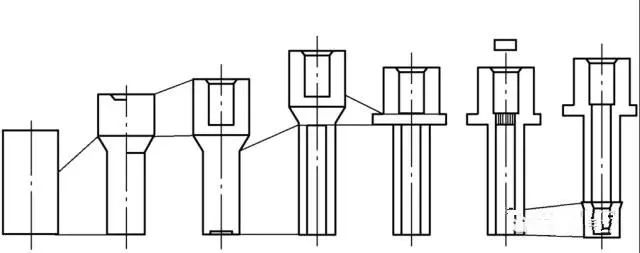 一般來說,冷鍛成形是通過多種工序的組合來獲得零件最終的形狀。圖2是冷鍛的一個例子。坯料切斷后,軸桿正擠壓,杯筒反擠壓,杯筒正擠壓,鐓粗,沖孔,管的正擠壓等組合而成。